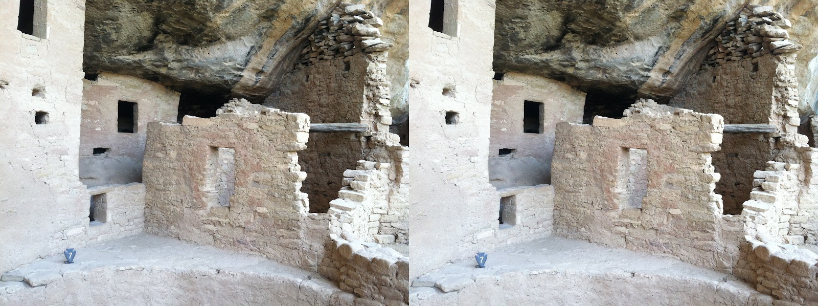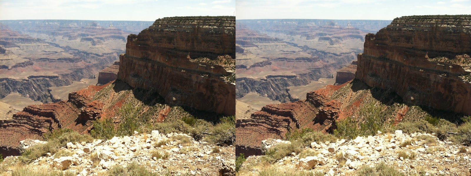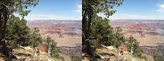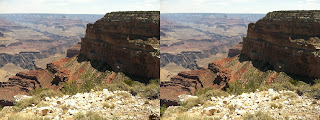 Let's start with this one, which isn't worth opening up larger. I moved the camera too much from side-to-side in between shots. (Nobody's eyes are 12 inches apart.) I am very nicely 3D, but the canyon behind me is just headache-inducing. Best to practice with this one just the way you see it here, and then open up the following ones to be larger: